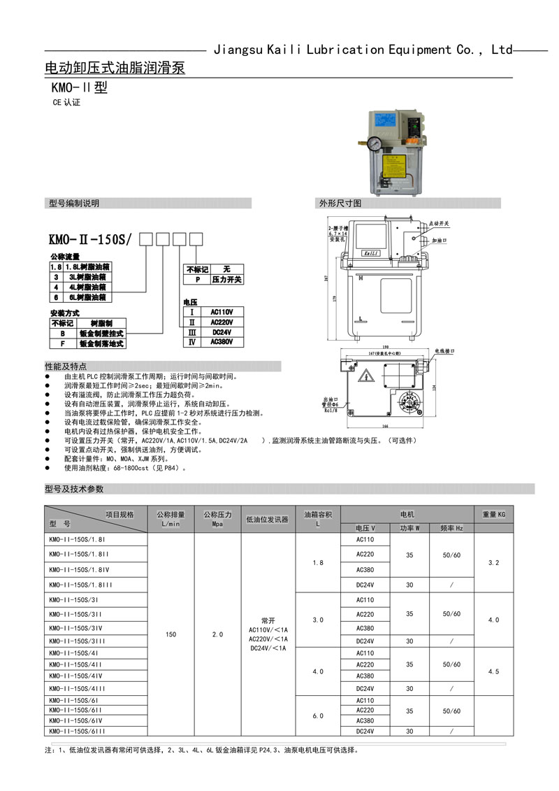 KMO-IV-150S型電動(dòng)潤(rùn)滑泵是AMO-IV-150S型的升級(jí)改進(jìn)版產(chǎn)品。潤(rùn)滑泵的油路設(shè)計(jì)也做了改進(jìn)性能更穩(wěn)定。油箱的容積為1.8L、3L、4L、5L采用德國(guó)原裝材料被美譽(yù)為透明金屬?蛻(hù)如果要求鋼制鈑金油箱可根據(jù)要求定做,該泵是一款自動(dòng)抵抗式集中潤(rùn)滑系統(tǒng)配置的產(chǎn)品,潤(rùn)滑泵的電壓有AC110V和AC220V可滿(mǎn)足不同客戶(hù)需求提供更多選擇。間隔潤(rùn)滑時(shí)間可以在設(shè)備的PC系統(tǒng)上根據(jù)實(shí)際需要設(shè)定,油泵設(shè)有低油位報(bào)警信號(hào)輸出和失壓報(bào)警信號(hào)輸出。該泵與MO系列容積加壓式式計(jì)量件、XJM系列容積加壓式式計(jì)量件(整體鋁合金設(shè)計(jì)無(wú)需連接體)FX-1型濾油器、F-3D型濾油器、PV、JV系列連接體。等管接件配套使用組成對(duì)機(jī)械設(shè)備定時(shí)定量自動(dòng)集中潤(rùn)滑為您的設(shè)備,降低油耗、提高使用壽命、提高加工精度、降低故障率、為您的設(shè)備保駕護(hù)航。也可致電我公司咨詢(xún)0515-84213666或者13770139320----QQ598425079我們將以最專(zhuān)業(yè)和 質(zhì)的技術(shù)服務(wù),可為客戶(hù)提供量身定做設(shè)計(jì)集中潤(rùn)滑系統(tǒng)方案。