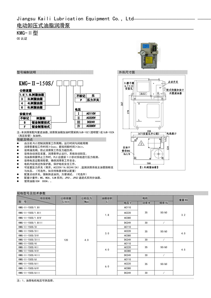 KMO-II-150S型電動(dòng)潤(rùn)滑泵是AMO-II-150S型的升級(jí)改進(jìn)版產(chǎn)品。潤(rùn)滑泵的油路設(shè)計(jì)也做了改進(jìn)性能更穩(wěn)定。油箱的容積為1.8L、3L、4L、5L采用德國(guó)原裝材料被美譽(yù)為透明金屬。客戶如果要求鋼制鈑金油箱可根據(jù)要求定做,該泵是一款自動(dòng)抵抗式集中潤(rùn)滑系統(tǒng)配置的產(chǎn)品,潤(rùn)滑泵的電壓有AC110V和AC220V可滿足不同客戶需求提供更多選擇。間隔潤(rùn)滑時(shí)間可以在設(shè)備的PC系統(tǒng)上根據(jù)實(shí)際需要設(shè)定,油泵設(shè)有低油位報(bào)警信號(hào)輸出和失壓報(bào)警信號(hào)輸出。該泵與MO系列容積加壓式式計(jì)量件、XJM系列容積加壓式式計(jì)量件(整體鋁合金設(shè)計(jì)無(wú)需連接體)FX-1型濾油器、F-3D型濾油器、PV、JV系列連接體。等管接件配套使用組成對(duì)機(jī)械設(shè)備定時(shí)定量自動(dòng)集中潤(rùn)滑為您的設(shè)備,降低油耗、提高使用壽命、提高加工精度、降低故障率、為您的設(shè)備保駕護(hù)航。也可致電我公司咨詢0515-84213666或者13770139320----QQ598425079我們將以最專業(yè)和 質(zhì)的技術(shù)服務(wù),可為客戶提供量身定做設(shè)計(jì)集中潤(rùn)滑系統(tǒng)方案。