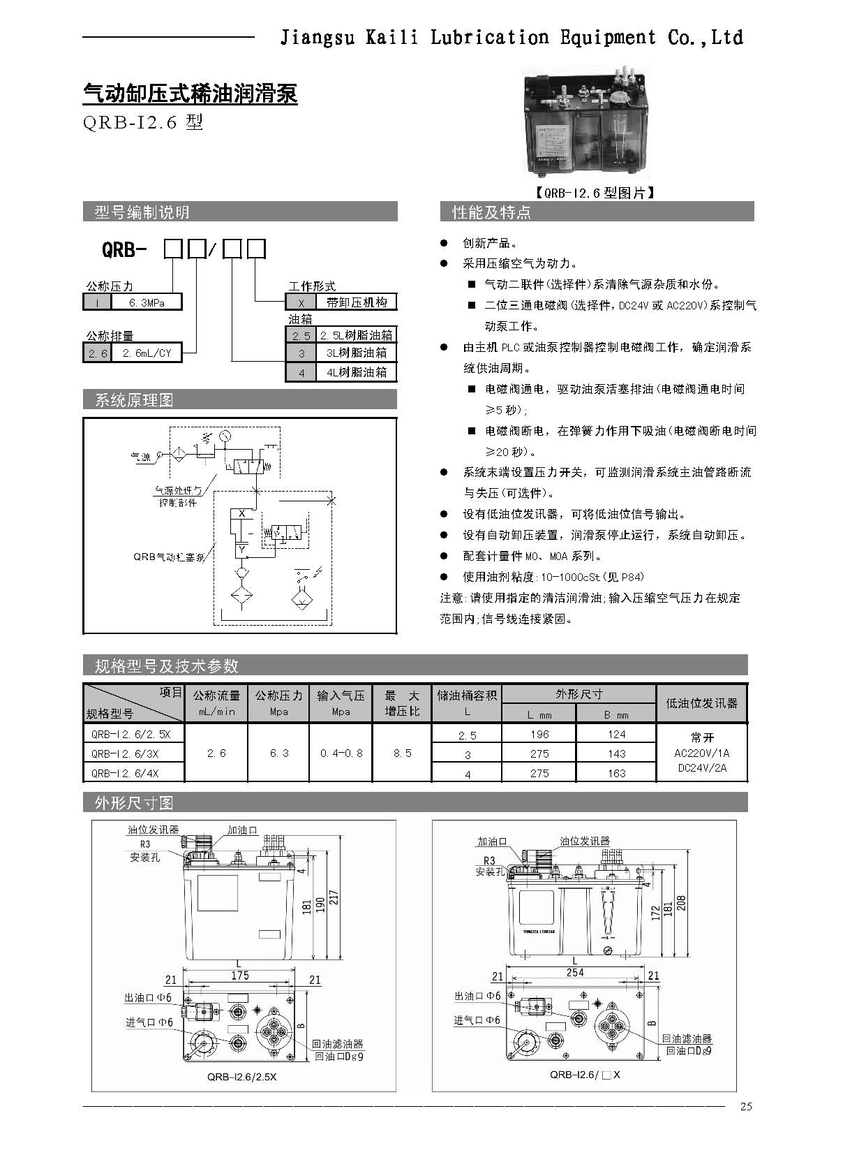 QRB2.6氣動潤滑泵,透明油箱采用德國原裝進口PC材料,使用壽命長永不不老化,容積規(guī)格有2.5L/3L/4L/5L/不同的容積規(guī)格供客戶選擇鋼制鈑金油箱可根據客戶的要求定做,主要要用于潤滑點較多的機械設備作為集中潤滑系統(tǒng)的供油泵站,和MO系列加壓容積式計量件、XMB系列加壓容積式計量件,配套使用,也可與XJM系列容積卸壓式計量件配套使用。可用于機械設備的集中潤滑也可作為氣動微量潤滑、也可用于微量油氣潤滑的金屬切削機床。本公司可根據客戶要求為用戶設計集中潤滑系統(tǒng)的方案。