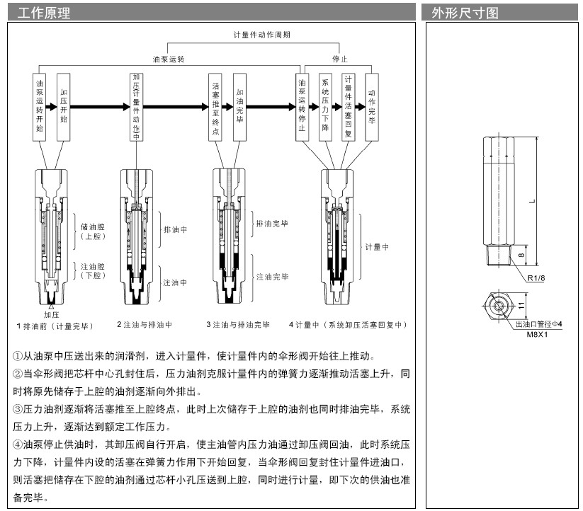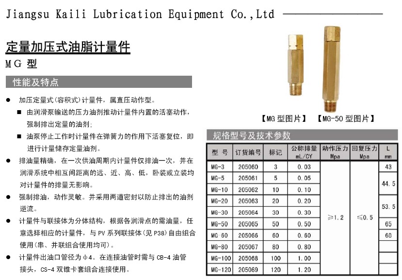MG系列容積加壓式油脂計(jì)量件可與KMG系列電動(dòng)油脂潤(rùn)滑泵和QRB系列氣動(dòng)潤(rùn)滑泵配套使用配套使用,適用大中小型設(shè)備的集中潤(rùn)滑,本產(chǎn)品可點(diǎn)定時(shí)定量計(jì)量 對(duì)潤(rùn)滑點(diǎn)供油,而且出有壓力高,特別對(duì)距離較遠(yuǎn)的潤(rùn)滑點(diǎn)能夠做到遠(yuǎn)距離供油。主要技術(shù)指標(biāo)和訂貨選型可參照樣本36頁(yè),如沒(méi)有產(chǎn)品樣本可在本公司官方網(wǎng)站下載電子版樣本。配套件FX-1型濾油器、F-3D型濾油器、LV、PV、JV系列連接體。等管接件配套使用組成對(duì)機(jī)械設(shè)備定時(shí)定量自動(dòng)集中潤(rùn)滑為您的設(shè)備,降低油耗、提高使用壽命、提高加工精度、降低故障率、為您的設(shè)備保駕護(hù)航。也可致電我公司咨詢0515-84213666或者13770139320----QQ598425079我們將以最專業(yè)和 質(zhì)的技術(shù)服務(wù),可為客戶提供量身定做設(shè)計(jì)集中潤(rùn)滑系統(tǒng)方案。